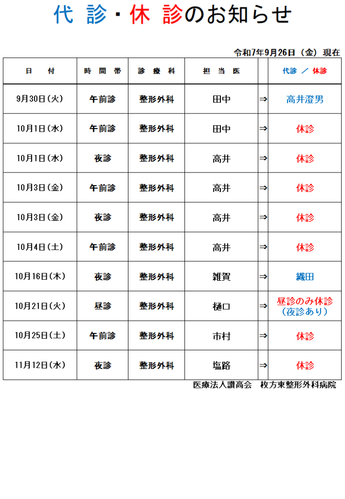 休診・代診のお知らせ【2025年9月26日更新】