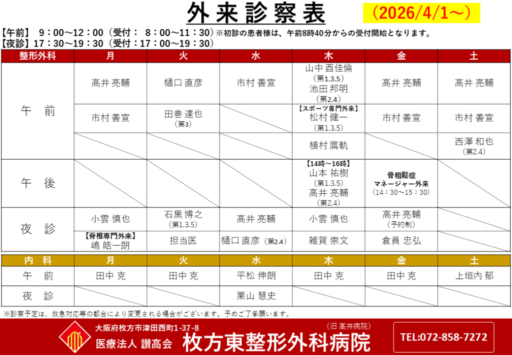 2026年4月1日より整形外科・内科の診療担当表を変更致します。